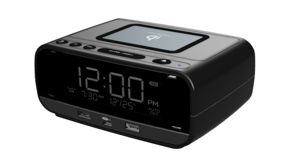 Designed for deployment into hotels, this alarm clock has unique features like simple setup, a single day alarm, Qi wireless charging for phones and wired charging for phones and tablets using USB-A and USB-C.